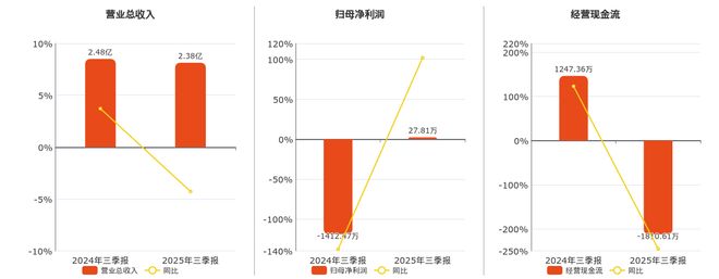 公司营业总收入为2.38亿元,较去年同报告期营业总收入减少1060.81万元,同比较去年同期下降4.27%。归母净利润为27.81万元。经营活动现金