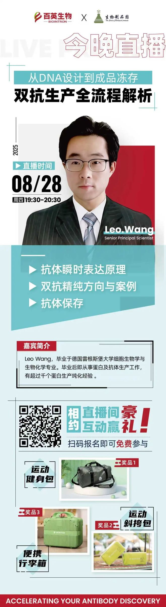 ”的直播分享。本次直播,带你深入了解双抗药物生产的全生命周期,解析从DNA设计、基因合成、纯化、质量检测到成品冻存的每一步关键技术和行业实践。整场直
